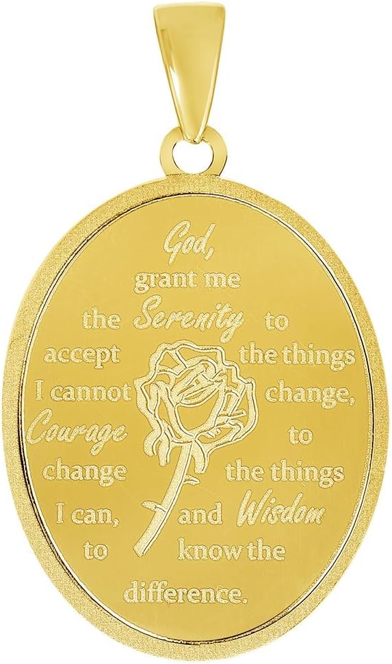 This unique handcrafted 14k Gold Double Sided Oval Medal Necklace ( 24mm x 15mm ) scripted with the Serenity Prayer is finished with a fine polish. You will find the 14k mark stamped that authenticates it to be genuine real 14k gold which is located on the pendants bail and near the chains lock. There are three different types of chains to choose from and are also real 14-karat gold. The Rolo cable chain is 0.5mm thick, the cuban curb is 2.5mm thick and the figaro is 2mm thick. Perfect any other occasions, order this today or browse our unique, trendsetting and affordable fine jewelry.