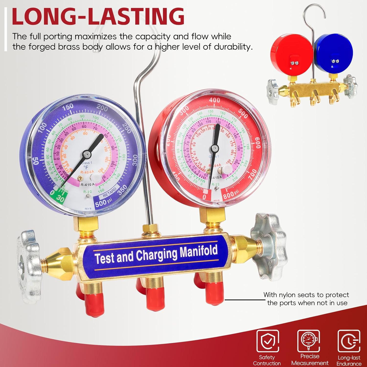 Upgrade 42001 2-Valve Series 41 Test and Charging Manifold, A/C Manifold Gauge, with 3-1/8” Large Gauges, (psi °F) fits R-22 R-404A R-410A Refrigerant, HVAC Gauges (No Hoses) Product Type: Mechanical Manifold Gauge Set Refrigerant CompatibilityR-22; R-404A; R-410A Number of Valves: 2 Number of Hoses: 0 Gauges High Side Red: 0 to 800 psig Gauges Low Side Blue : 30 in Hg to 350 psi Gauge Reads in Fahrenheit Gauge Accuracy: +/-1.00% Vacuum Port Size: 1/4 in Material: Forged Brass This manifold gauges set can test, evacuate, and charge refrigeration and A/C systems. They have high and low side dial pressure gauges on a manifold with a hanging hook. Whether you're working on a household refrigerator, commercial HVAC system, or a car's air conditioner, this 42001 charing manifold has you covered.
