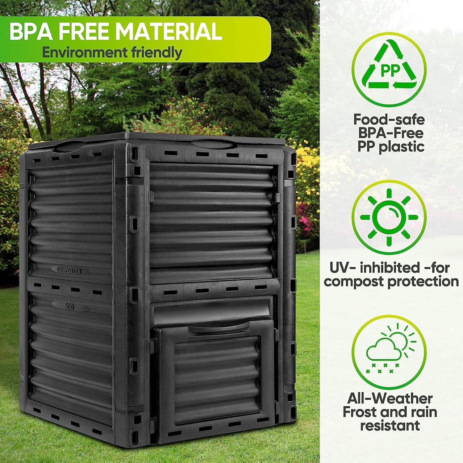 Our composters take only a short time to compost and ferment, it only takes about 6-8 weeks to fully compost the material into a compost for direct use in the garden.SpecificationColor: BlackMaterial: PPOverall Dimensions: 23.9 x 23.8 x 32.4 inch/60.7 x 60.5 x 82.5 cm (L x W x H)Volume: 80 gallons (300L)Net Weight: 5.2 kgPackage Includes:1 x Garden Compost BinNotes:Manual measurement, please allow slight errors on size.The color may exist a slight difference due to different screen displays.