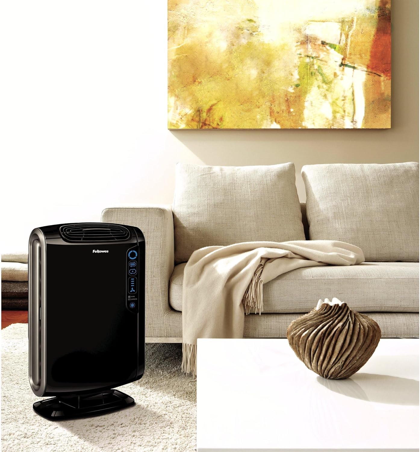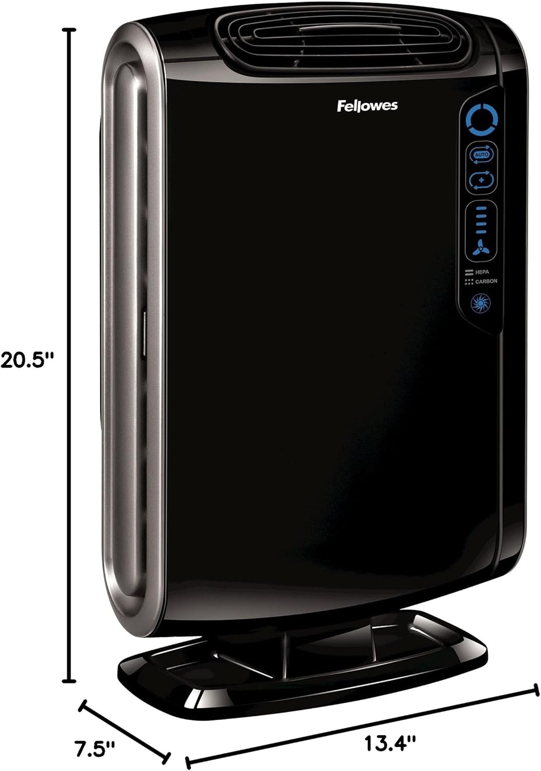 The Fellowes AeraMax 300 Air Purifier uses 4-stage True HEPA filtration to effectively purify air in large rooms 300 – 600 square feet. The AeraSmart™ sensor monitors the air quality and automatically adjusts the fan speed to keep your air purified with ultra-quiet operation. A True HEPA filter Captures up to 99.97% of particles as small as 0.3 microns, including allergens, such as pollen, dust, pet dander, and smoke; a carbon filter removes odors and captures large airborne particulates. AeraMax air purifiers feature PlasmaTrue™ Technology as an optional setting that utilizes ionization to help safely remove airborne pollutants. AeraMax Air Purifiers also features Aera+™ mode for 35% more air exchanges during allergy and cold/flu seasons.
