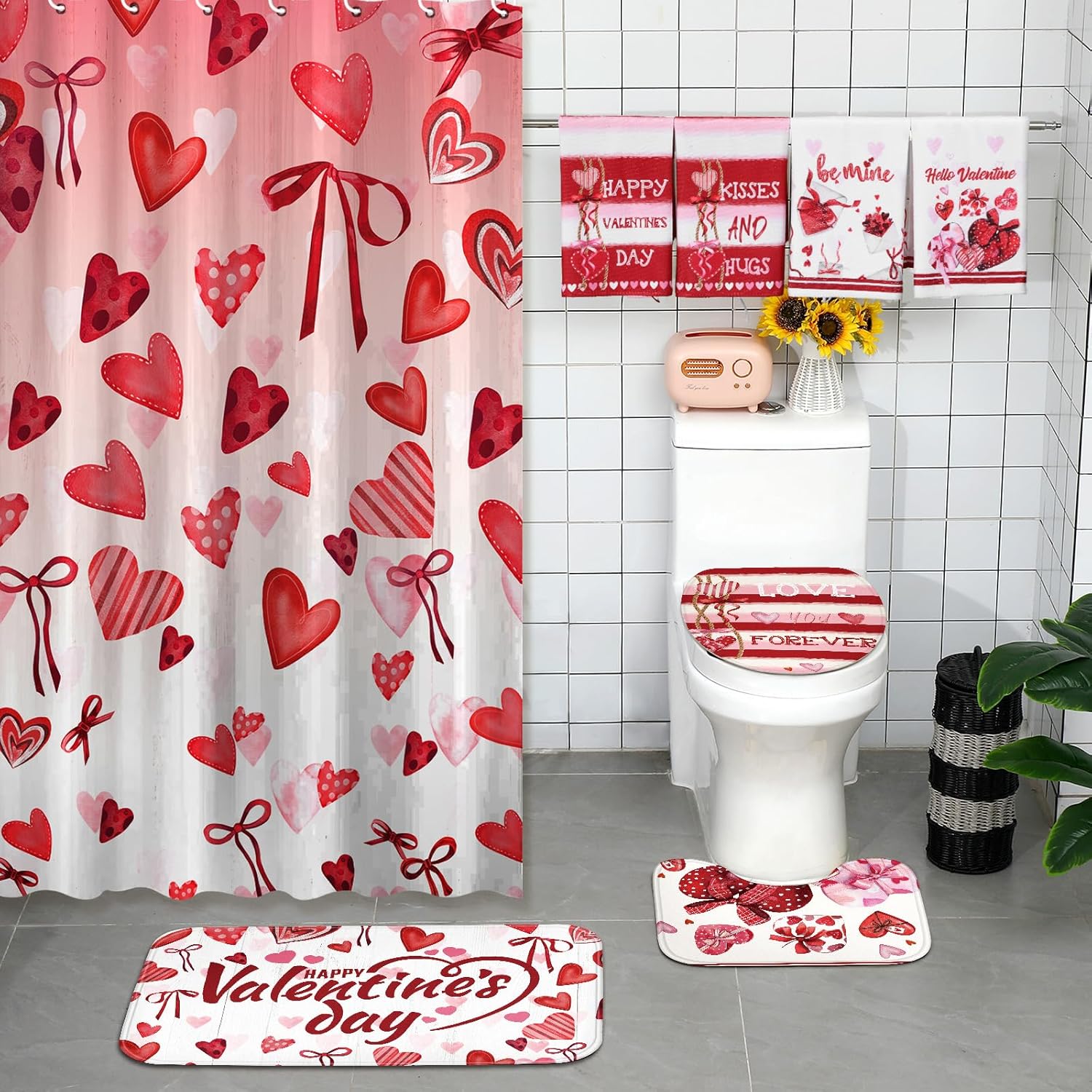Features: Multifunctional Valentine's Day towels: Our set comes with 4 Valentine's Day microfiber towels, stylish yet functional. These towels, sized at 21.3 x 14.2 inches/ 54 x 36 cm, are suitable for drying off and as decorative pieces, creating a cohesive Valentine's Day atmosphere in your bathroom. Versatile and user friendly: The versatility of our Valentine's Day bathroom set greatly enhances its worth. Whether you own a house, an apartment, or live in a dormitory, this set will seamlessly blend into your bathroom space. The user friendly nature of our set, including the inclusion of 12 hooks, ensures its instant use. Specifications: Material: Towel: microfiber cloth Shower curtain: flannel U shaped rug: flannel Toilet lid cover: flannel Bath mat: flannel Main color: red Size: Towel: about 21.3 x 14.2 inches/ 54 x 36 cm Shower curtain: about 72 x 72 inches/ 183 x 183 cm U shaped rug: about 17.7 x 15 inches/ 45 x 38 cm Toilet lid cover: about 17.7 x 13.8 inches/ 45 x 35 cm Bath mat: 29.5 x 17.7 inches/ 75 x 45 cm Package includes: 4 x Towel 1 x Shower curtain 1 x U shaped rugs, 1 x Bath mat 1 x Toilet lid cover Notes: Manual measurement, please allow slight errors on size. The color may exist a slight difference due to different screen displays
