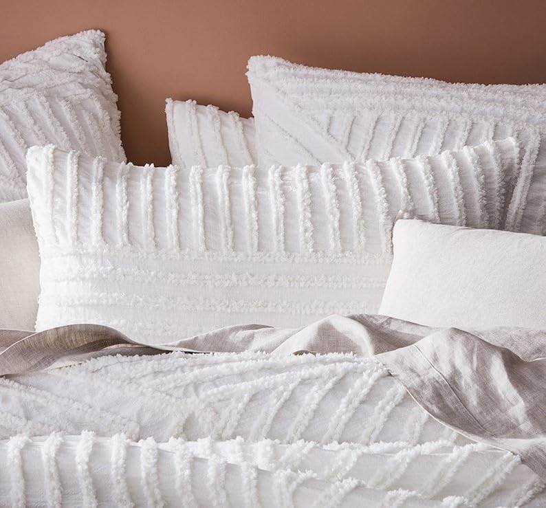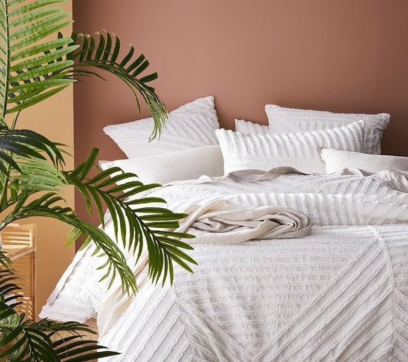Transform your bedroom into a serene sanctuary with this stunning textured duvet cover. The elegant wave-like pattern creates a sophisticated dimensional effect that adds visual interest and tactile comfort to your bedding ensemble. The pure white color scheme promotes a calm, minimalist aesthetic while the tufted design adds luxurious texture and warmth. Perfect for creating a hotel-like atmosphere in your own home, this duvet cover instantly elevates any bedroom's style. The versatile design complements both modern and traditional decor, while the neutral palette allows for endless styling possibilities with your existing furnishings. The cover features a subtle yet striking raised pattern that creates a peaceful, flowing aesthetic reminiscent of gentle waves or rolling dunes. Pair with your favorite plants and natural decor elements to create a tranquil sleep environment that promotes rest and relaxation.
