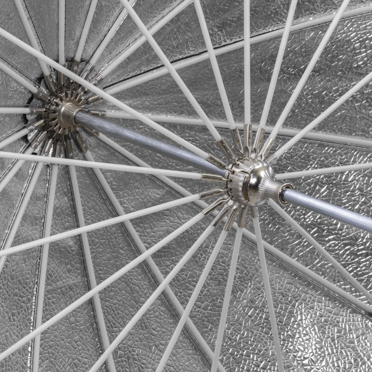 With the Glow EZ Lock 65" Black/Beaded Silver Deep Umbrella, you can effortlessly control and manipulate your lighting environment. This umbrella features a dynamic parabolic shape and an innovative EZ lock system, eliminating the common frustrations associated with traditional umbrella setup and takedown. The unique locking device is designed to encircle the shaft, providing a comfortable grip for easy opening. A wide release button ensures a smooth, pain-free shooting experience. This extra-large deep umbrella is versatile, making it ideal for a range of photography styles, from fashion to portraiture. It's capable of illuminating entire individuals and small groups with a smooth yet vibrant light.The beaded silver interior of this umbrella helps create specular highlights, bringing out sharp details and providing brilliant indirect lighting. It also aids in soft shadow definition, making it perfect for achieving maximum light output and reaching larger groups, while creating spectacular contrasts.Constructed with meticulous attention to detail, this umbrella boasts a robust build, featuring resilient fabric and durable fiberglass frame ribs. It sets the bar for portable light control, ensuring optimal performance for both people and subject photography.Like all premium Glow products, this umbrella comes with a fitted, durable fabric pouch for safe transport and storage, offering a superior alternative to traditional plastic umbrella casings
