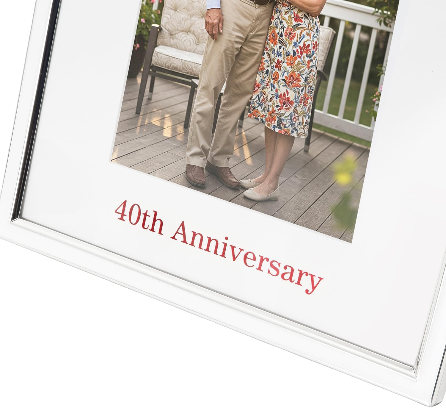 Contemporary and elegant silver plated metal rectangular picture frame with inner white glossy epoxy finish. Makes for a lovely and thoughtful gift for a couple celebrating their 40th ruby wedding anniversary. Features eye-catching wording "40th Anniversary" at the bottom of the frame in red foil with double silver rings adorning small diamante crystals. This beautiful sentiment picture frame holds a single 5" x 7" photograph with transparent glass protective cover. The total frame size dimensions are as follows: Height - 8", Width - 6" - (20cm x 15cm). This picture frame can be wall hung using the D-ring clip as well as table mounted. Features luxurious black velveteen felt on the back of the frame giving this a very luxurious look and feel.