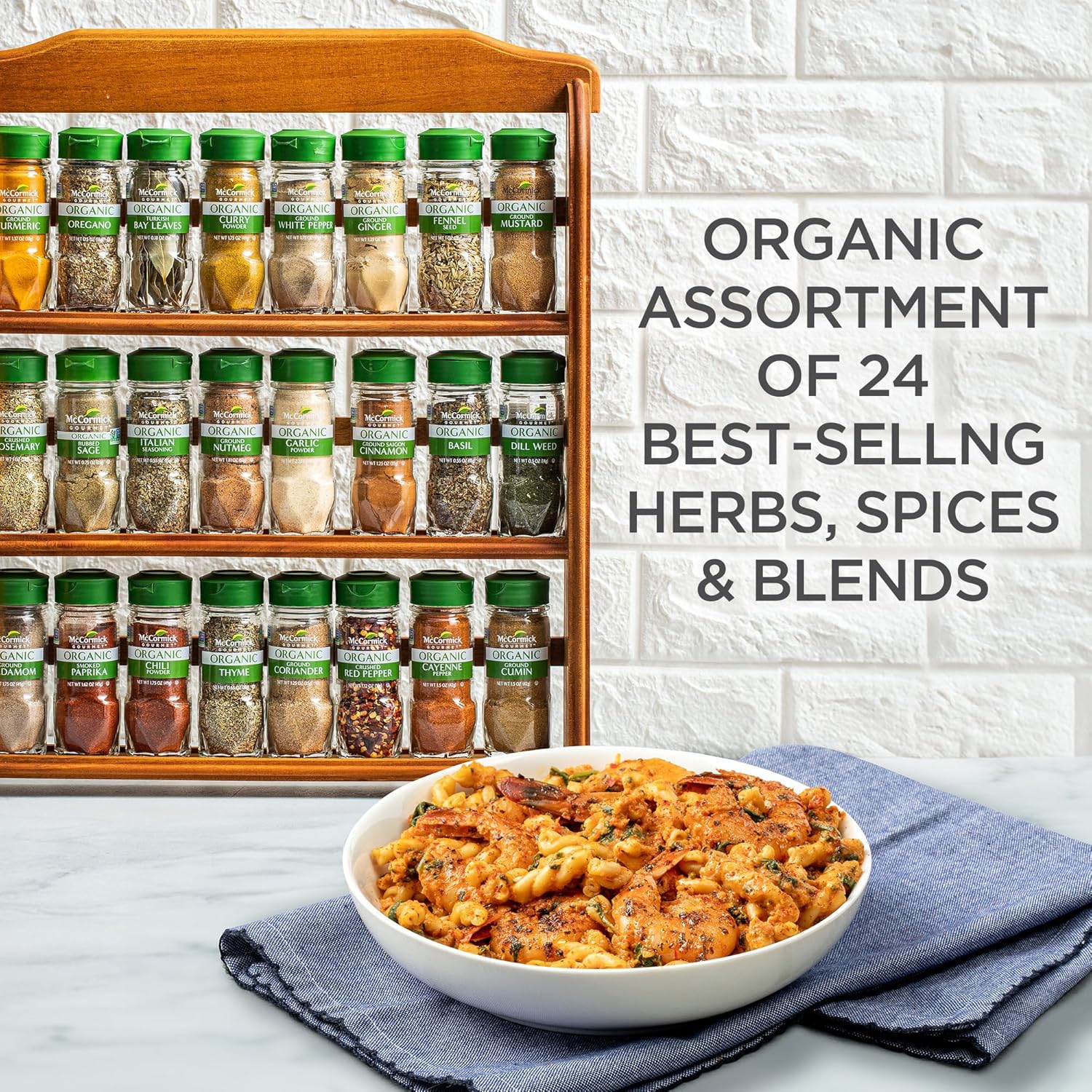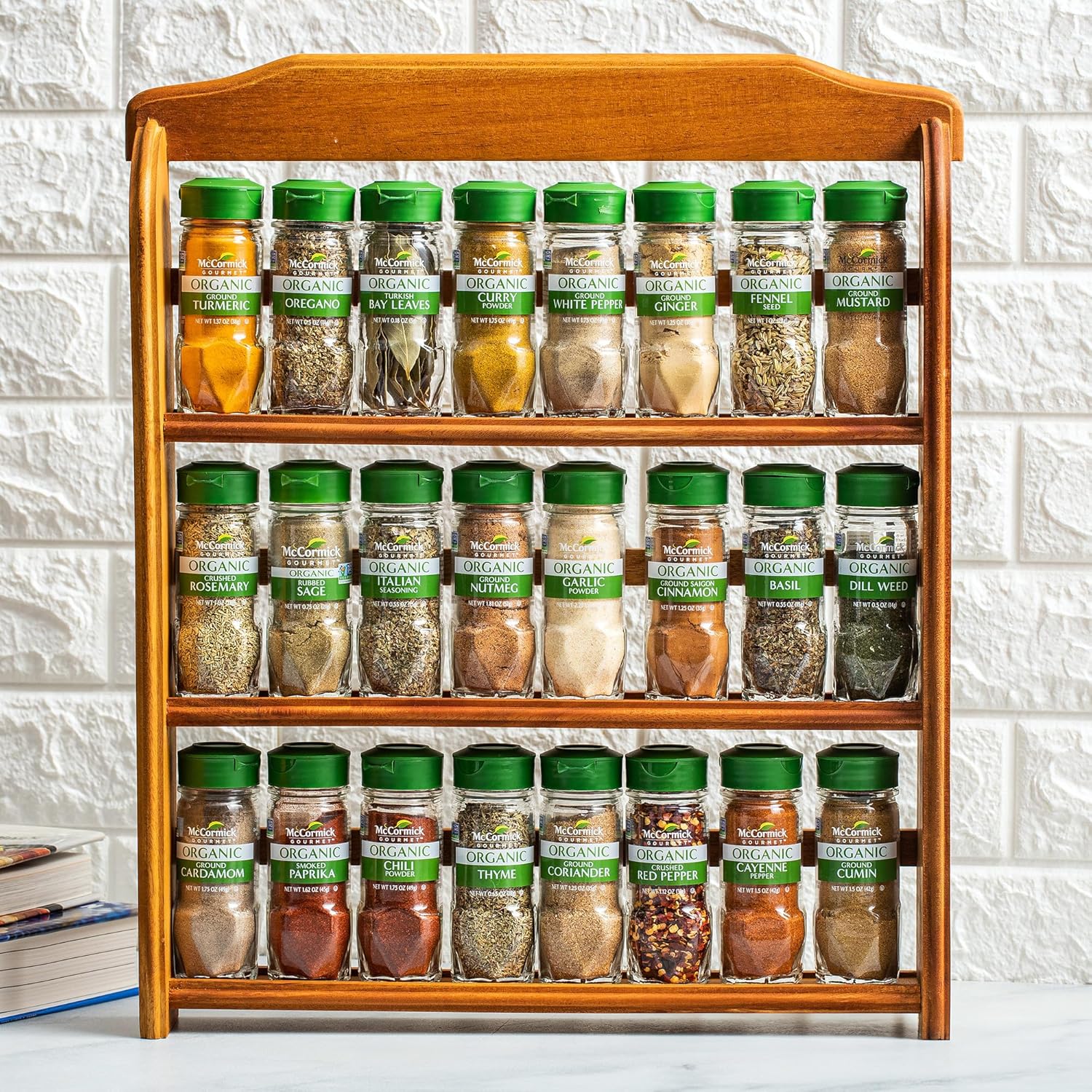 McCormick Organic Spice Rack features 24 of our highest quality organic herbs and spices. This kitchen must-have can be a countertop spice rack or mounted to the wall (requires 2 screws). Our spice rack with spices included offers unbeatable value vs buying individual spices - perfect wedding, holiday or housewarming gift. 3 shelf spice rack has: Organic Basil .55 oz, Organic Celery Seed 1.62 oz, Organic Ground Saigon Cinnamon 1.25 oz, Organic Dill Weed .5 oz, Organic Ground Ginger 1.5 oz, Organic Paprika 1.62 oz, Organic Crushed Rosemary 1 oz, Organic Thyme .65 oz, Organic Turkish Bay Leaves .18 oz, Organic Cayenne Pepper 1.5 oz, Organic Ground Cumin 1.5 oz, Organic Toasted Sesame Seeds 1.37 oz, Organic Marjoram .37 oz, Organic Coarse Ground Black Pepper 1.62 oz, Organic Herbes de Provence .65 oz, Organic Poultry Seasoning .87 oz, Organic Garlic Powder 2.25 oz, Organic Ground Nutmeg 1.81 oz, Organic Cinnamon Sticks .75 oz, Organic Yellow Mustard Seed 2.12 oz, Organic Crushed Red Pepper 1.12 oz, Organic Curry Powder 1.75 oz.