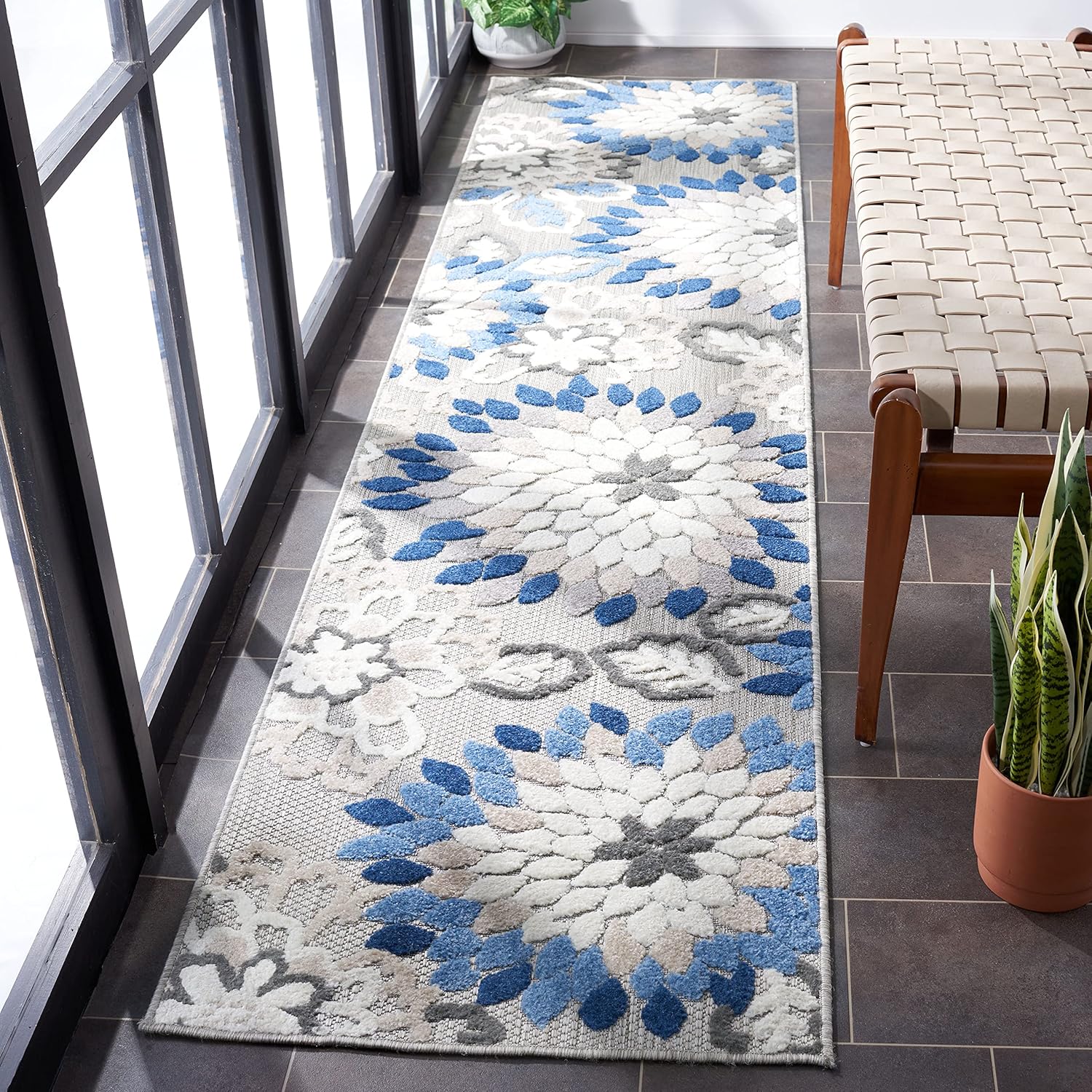 Cabana indoor-outdoor area rugs bring a splash of color and pattern to any living space. Their sturdy polypropylene material makes them ideal for rain or shine. With charming floral patterns, these rugs work beautifully in the kitchen, sunroom, entryway, family room, patio, or mudroom.