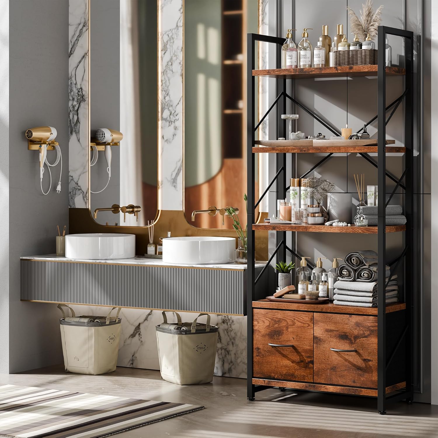 Maximize your space with this tall, 5-tier bookshelf. Its slim design offers substantial storage without consuming much floor space, perfect for tight corners. Built with a reinforced metal frame, it ensures wobble-free stability for up to 50lbs per shelf. The removable fabric drawer adds versatile organization, while the modern industrial style, blending wood grain and black metal, elevates any room's decor. Best of all, you can assemble it in just 15 minutes with tool-free connectors for instant, stylish storage.