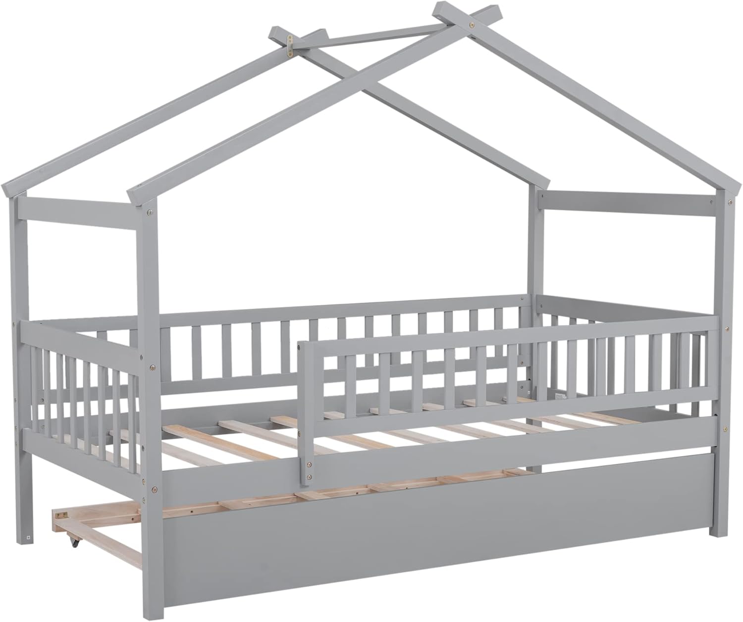 ๐This twin bed with house-style structure, trundle is an outstanding piece that you cannot refuse! The space-optimizing and house-shaped design is a thoughtful consideration of giving a satisfactory experience of closing to the nature and family warmth. Moreover, the house-shaped wooden structure integrated to the bed provides you with architectural aesthetics, along with the contemporary and minimalistic-style appearance. โ โ โ Description Product Type: Twin House Bed Size: Twin Color: Natural/White/Gray Material (main): Pine wood+Plywood+PB Number of Slats Bed: 10 slats; Trundle: 7 slats Spring Box: No need Assembly Required: Yes Manual and Hardware: Yes Country of Origin: Vietnam โ โ โ Technical Details Overall Product Dimension: 81.7" x 41.8" x 64" Overall Product Weight: 83.8 lbs Bed Weight Capacity: 200 lbs Suggested Mattress Thickness: 6 inches or less โ โ โ Notes 1. Manual measurement has been used,there may be some reasonable error. 2. All the pictures are taken by actual samples, slight chromatic aberration may occur due to lighting or display.
